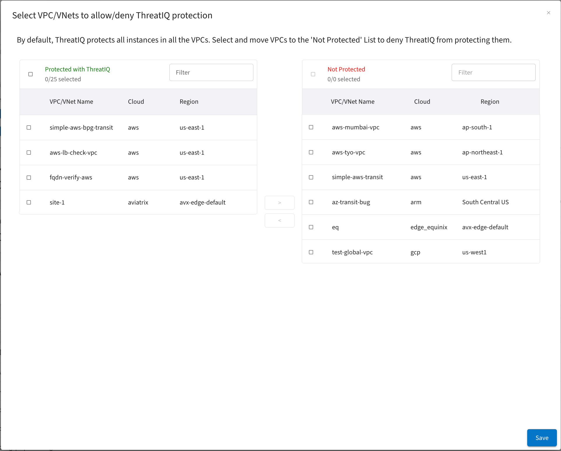 - Any VPC/VNets that are not currently protected on the Threat IQ > Configure Exclusion List for VPCs page should have a SmartGroup configured that excludes those VPC/VNets from threat analysis.